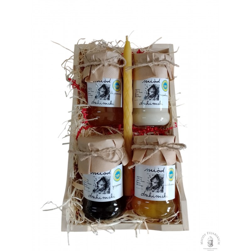 Zestaw Świąteczny w którego skład wchodzi: miód wielokwiatowy 350g, lipowy 350g, gryczany 350g, rzepakowy 350g oraz świeca z naturalnego wosku pszczelego. Ilość ograniczona ,do każdego zestawu mały słoiczek orzeszków w miodzie gratis:)